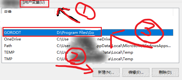 在用户变量中点击新建,加入变量名为GOROOT,值为D:Program FilesGo(你的安装地址Go)。