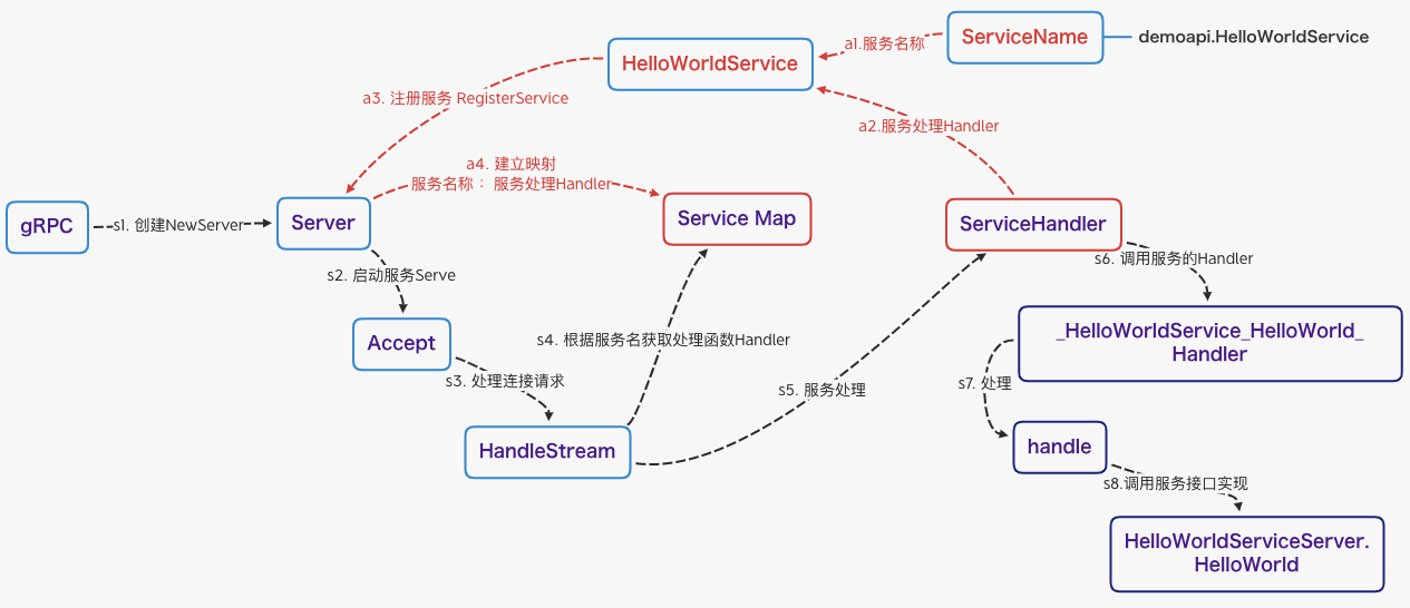 简化的注册服务处理器函数,启动gRPC服务,调用请求和执行数据流图如下所示: