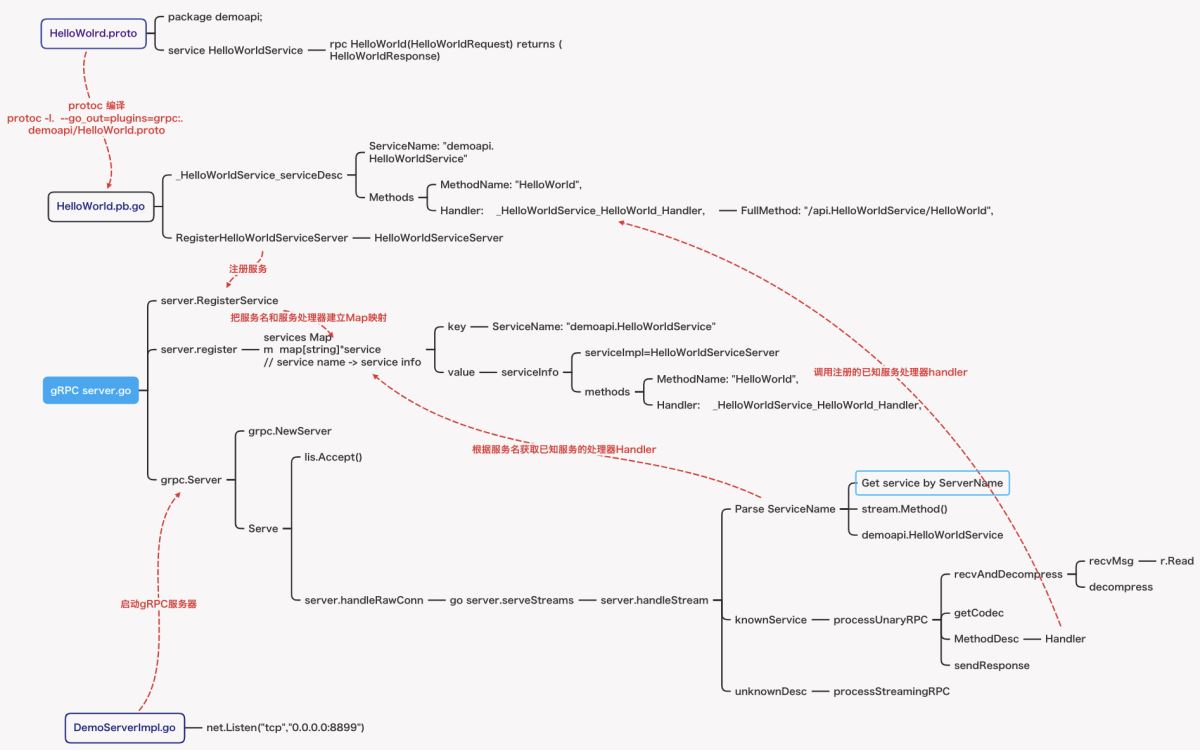 - 通过如下的服务名中的方法名HelloWorld,并在Method的map中找到这个方法的处理器函数Handler,并执行这个Handler函数,实现gRPC服务的调用