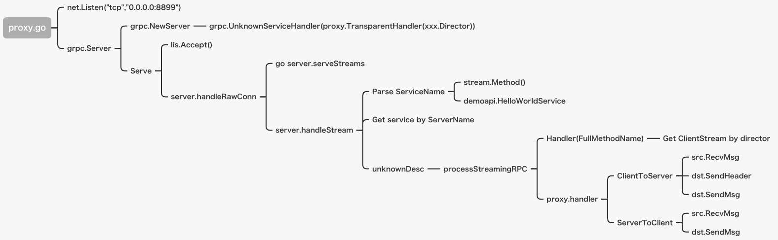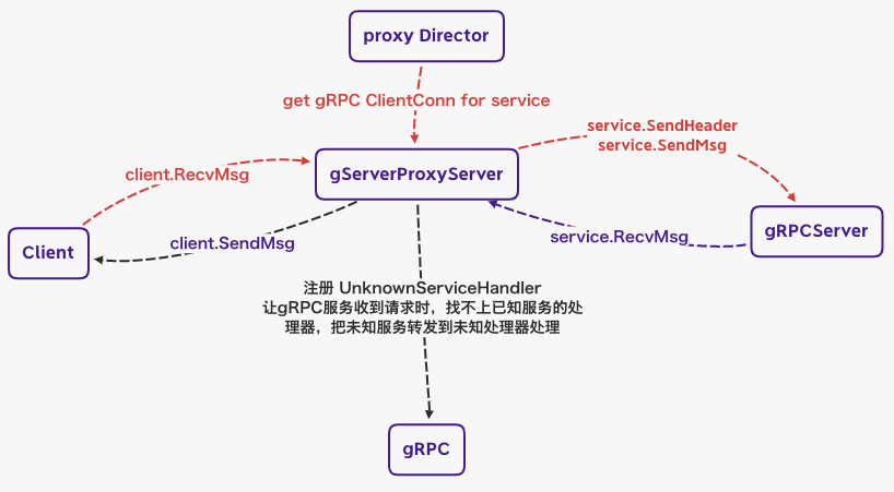 - proxy接收gRPC客户端的连接,并使用gRPC的RecvMsg方法,接收客户端的消息请求