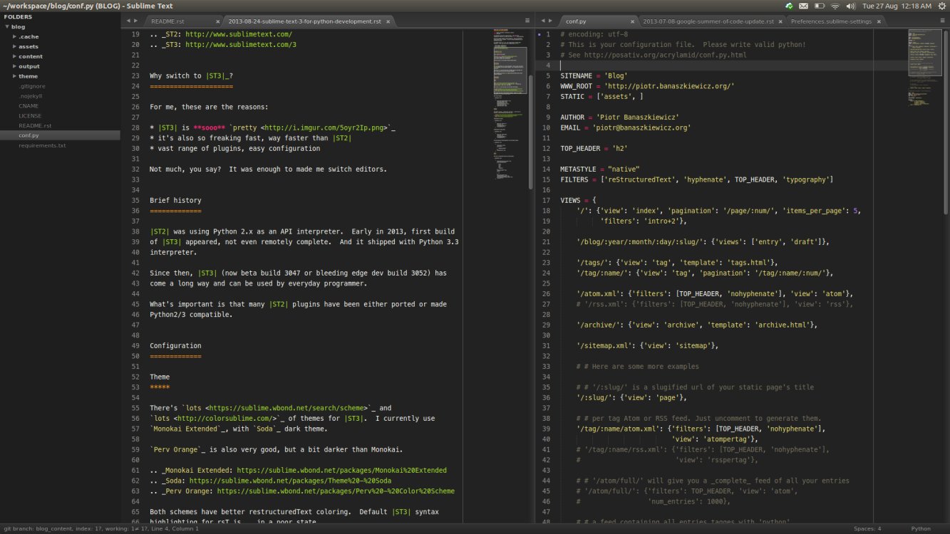 虽然现在的 Sublime 3 还处于 beta 阶段, 但已经非常稳定了, 而且速度比 Sublime 2 得到了增强. Sublime 3 可以到官网下载并安装. Sublime 虽然是免费软件, 但如果有足够的经济能力, 可以考虑购买以表示支持.