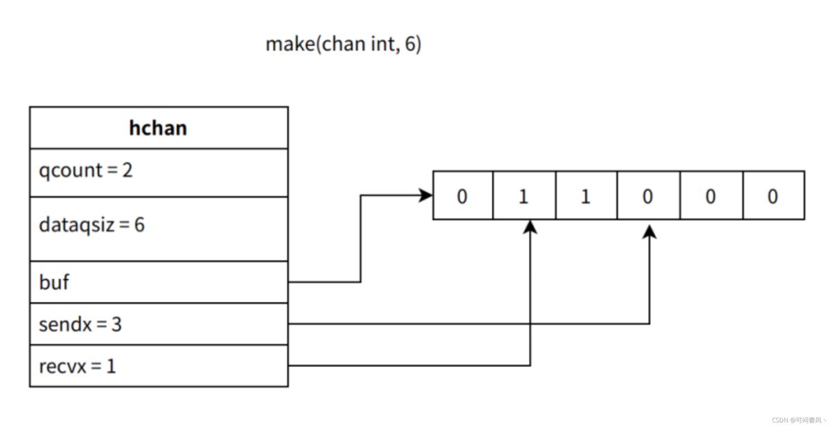 chan内部实现了一个环形队列作为缓冲区,队列的长度在创建chan时指定: