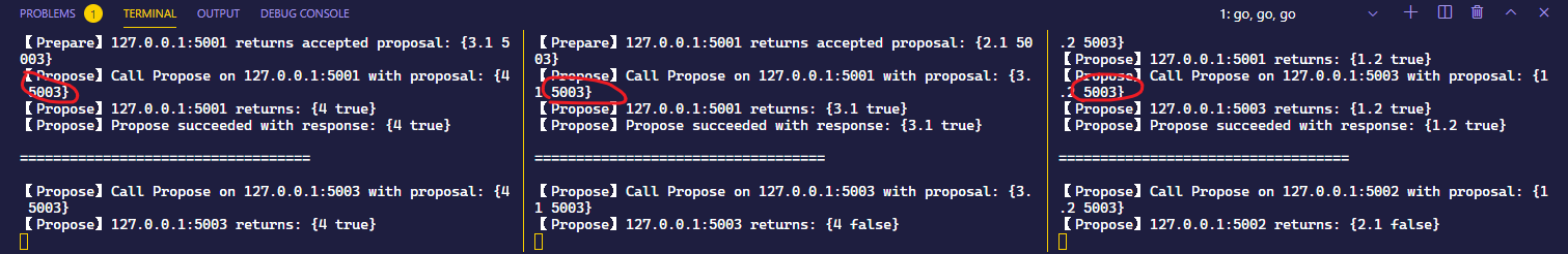 可以看到3个服务尽管一开始会尝试以他们自己的端口号(5001,5002,5003)作为提议值,在Prepare/Propose失败后,都会重新生成更大的ProposalID并开启新一轮的提议过程(Prepare,Propose),且最后都以5003达成一致。
