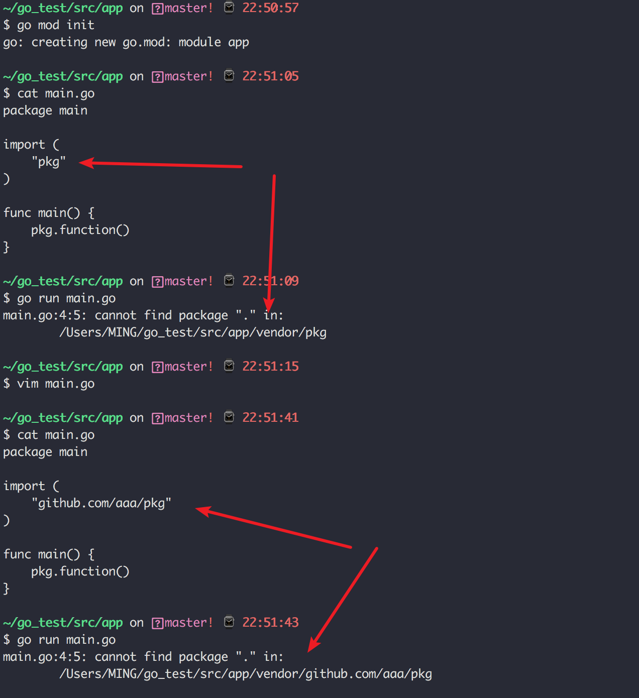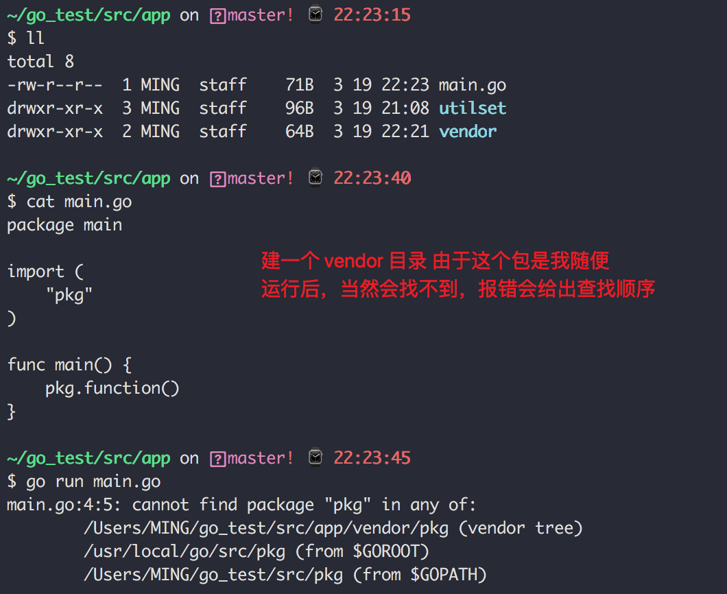 为了验证这个过程,我在创建中创建一个 vendor 目录后,就开启了 vendor 模式了,我在 main.go 中随便导入一个包 pkg,由于这个包是我随便指定的,当然会找不到,找不到就会报错, Golang 会在报错信息中打印中搜索的过程,从这个信息中,就可以看到 Golang 的包查找优先级了。