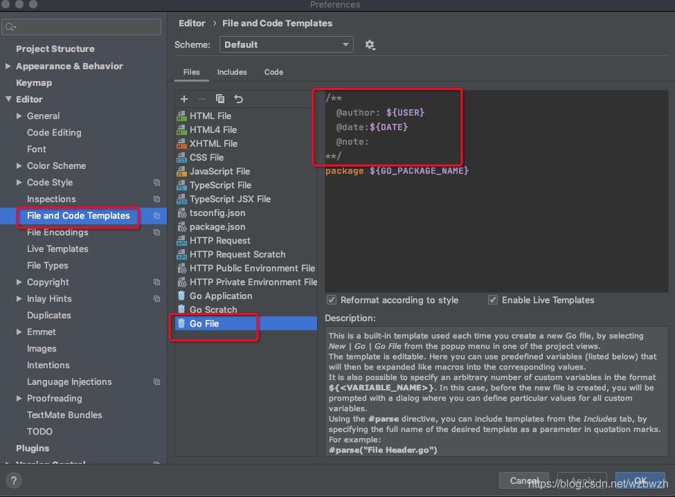 Preferences | Editor | File and Code Templates 打开go File 在右侧输入模板,然后点击Apply;