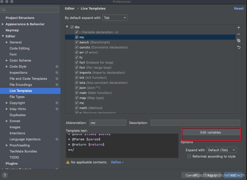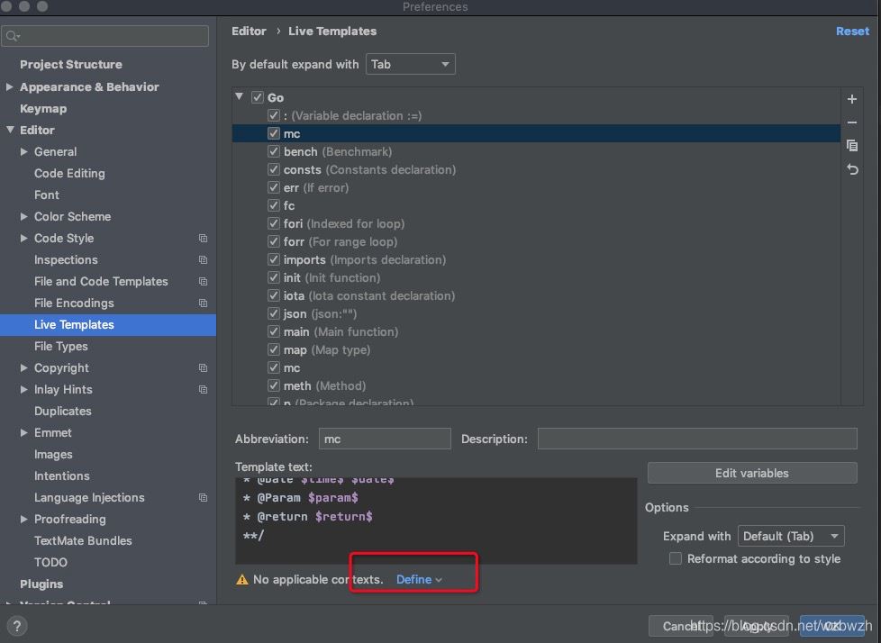 1、Preferences | Editor | Live Templates 打开Live Templates,如下图打开go,点击右侧的➕ ,选择live_Template,
