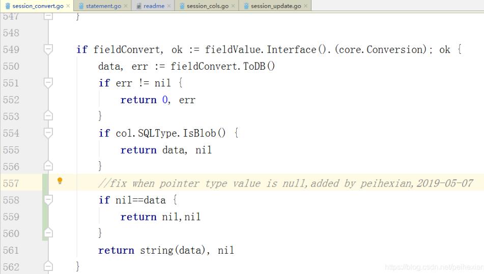 之所以加这个代码是因为xorm作者没有考虑指针类型字段值为nil的情况,xorm对有转换的字段要么当成数字,要么当成了字符串,这两种对于NULL类型的值都不适用,所以需要增加if nil==data return nil,nil这样的代码,还是把数据值组织成interface(nil)去给数据库驱动去处理。