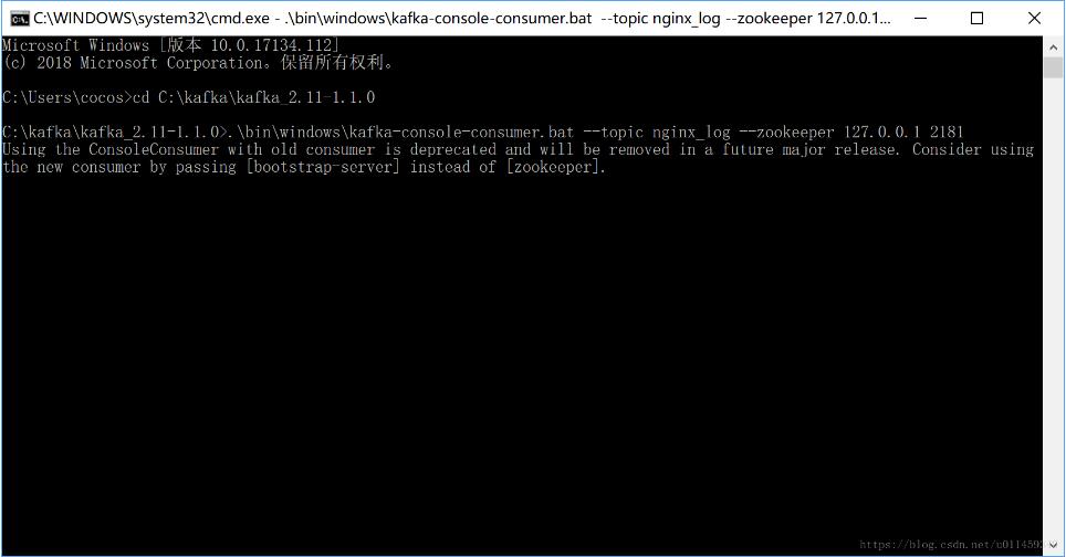 .binwindowskafka-console-consumer.bat --topic nginx_log --zookeeper 127.0.0.1 2181