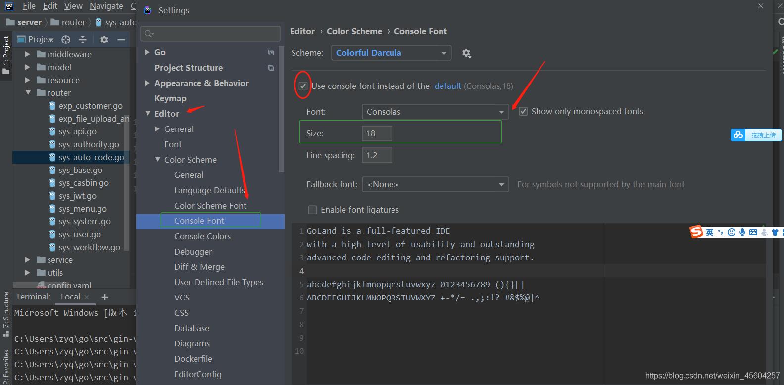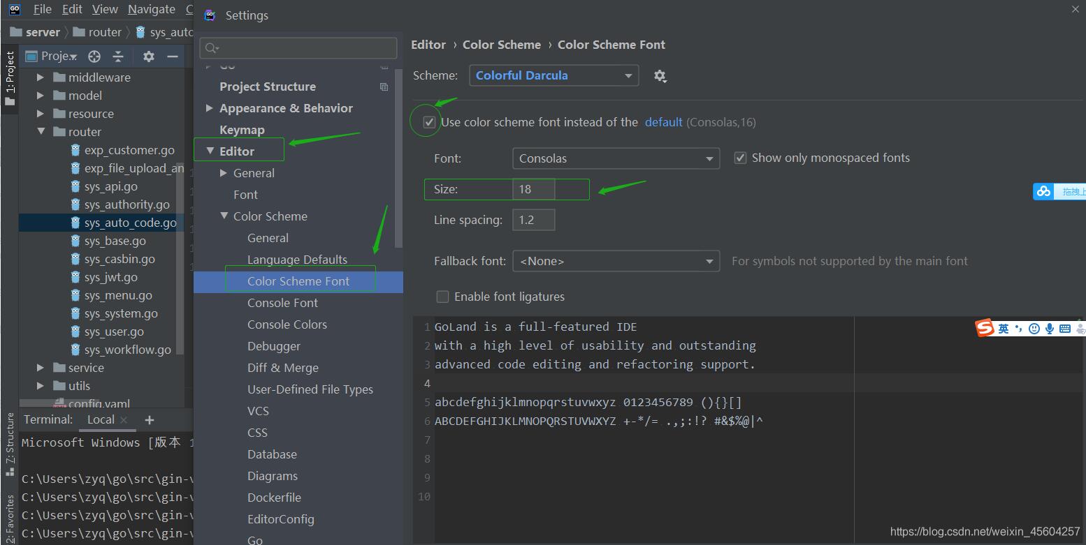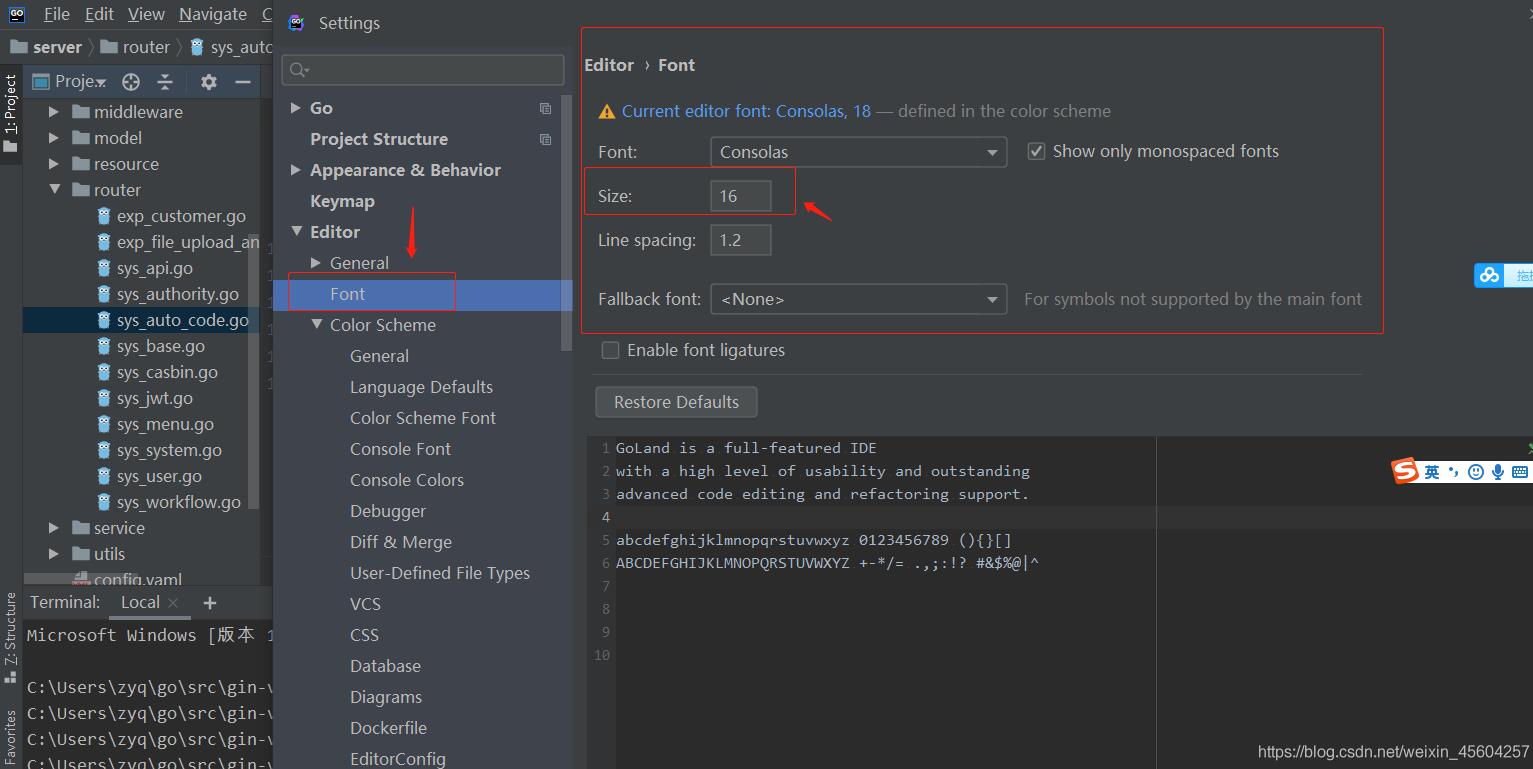 以上就是完美天空最近收集整理的关于Goland调节字体大小的设置(编辑区,terminal区,页面字体)的全部内容,更多相关Goland调节字体大小内容请搜索靠谱客的其他文章。