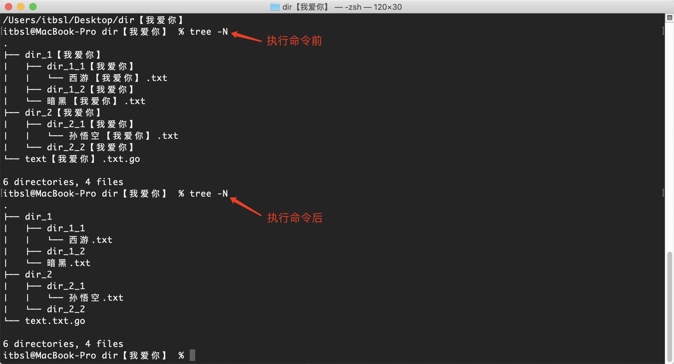 如下图,我的桌面有一个名为dir【我爱你】的目录,而且这个目录下的子目录和文件都包含【我爱你】,这个【我爱你】对于我们来说是完全无用的,我们可以用Go的文件操作库来递归对文件进行重命名,把不需要的名字替换为空