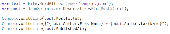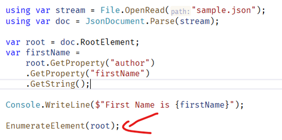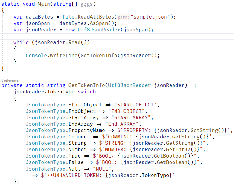 Main方法里面,我们使用 File .ReadAllBytes 从 sample .json 文件读取数格式为 byte[] ,然后通过 AsSpan 这个扩展方法将其转化为 Span <byte> 数据类型,然后把它传递到 Utf8JsonReader 的构造函数来创建一个JSON的 reader 。