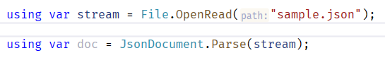 这里我通过 File .OpenRead 把 json 文件转化为 stream 。然后使用 Json Document.Parse 方法把 stream 解析成 JSON 文档对象模型。