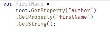然后通过 root 这个 JsonElement 类型的对象的 GetProperty 方法来获得相应的属性,而且这个方法可以连串使用: