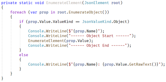 这个方法接受 JsonElement 类型的对象,然后对该元素的属性进行循环。