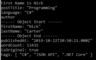 接下来使用while循环对JSON数据的每个 Token 进行读取,每次执行 Read() 方法时, reader 就会移动到 JSON 数据里面的下一个 Token 那里。
