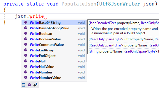 参数类型是Utf 8JsonWriter 。通过智能提示可以看到它提供了很多用于写入不同类型数据的方法。