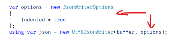 这里对输出进行了缩进,最后把这个options传递给Utf 8JsonWriter 的构造函数即可。
