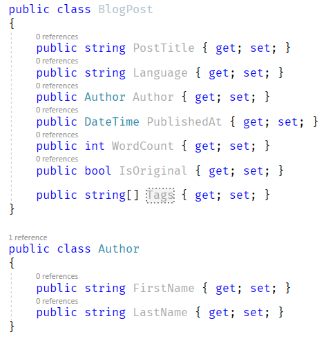 然后我试图打印出反串行化之后的一些属性数据。但是这不会成功。因为JSON文件里面数据的大小写命名规范使用的是 camel casing (简单理解为首字母是小写的),而默认情况下 Deserializer 会寻找 Pascal casing 这种规范(简单理解为每个单词的首字母都是大写的)的属性名。