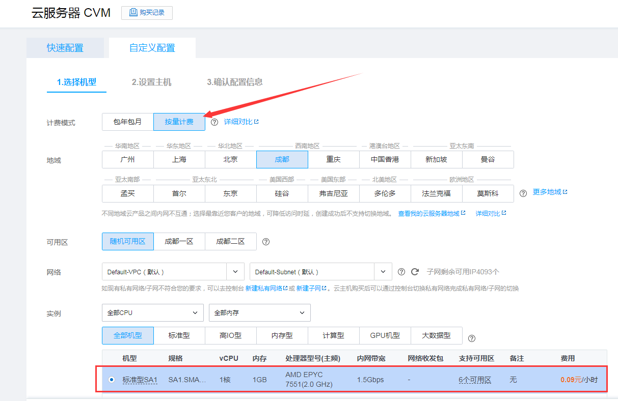 按照图下,选择【按量计费】,选地区(我用的最便宜的成都地区),选机型(最便宜的,够用)。