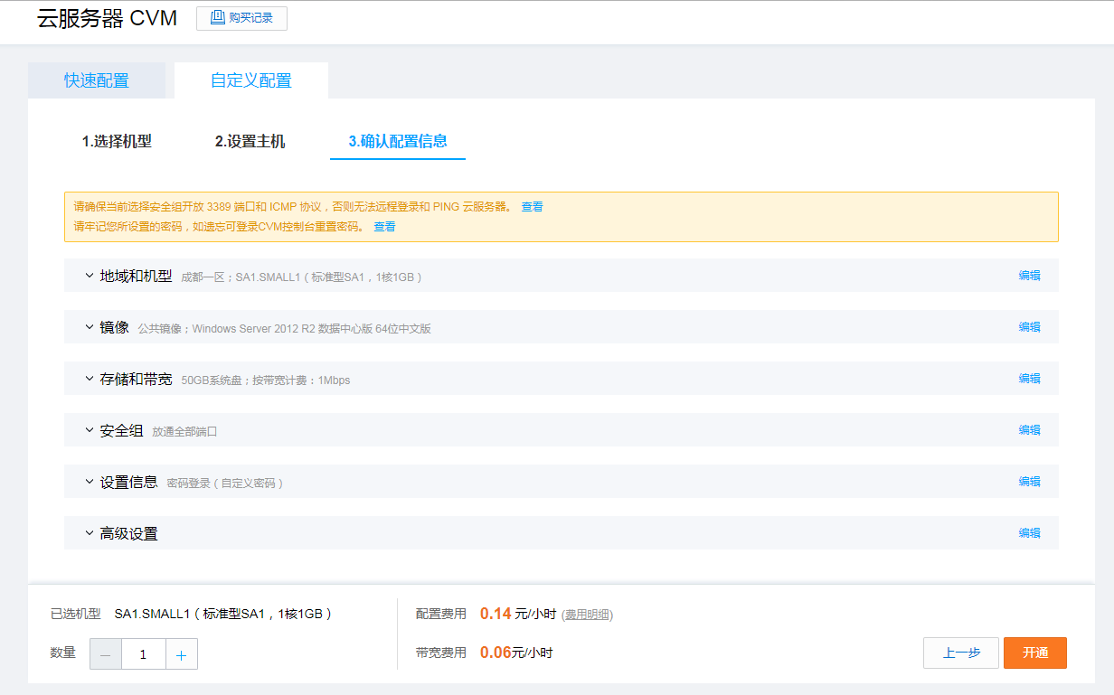 下一步设置主机,选择【新建安全组】,然后下拉框选【放通全部端口】(因为我们是学习临时使用,不用在意什么安全性的问题了)
