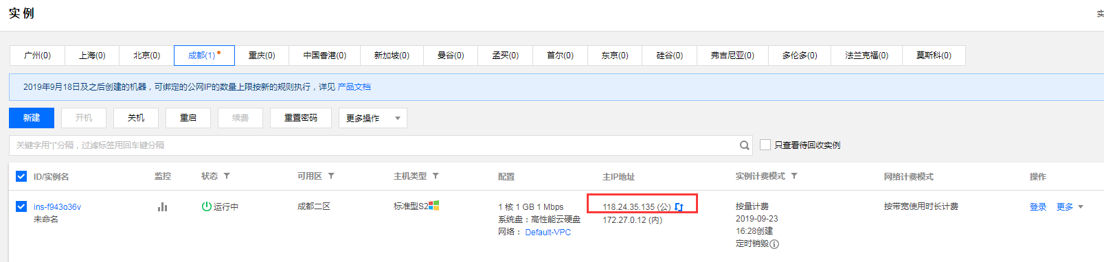开通后自动跳转到控制台实例页面,可以看到我们的公网IP了。