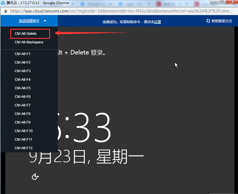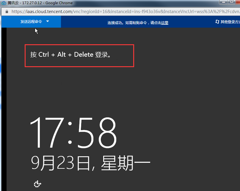 右上角打开【发送远程命令】,点击【Ctrl-Alt-Delete】登录。