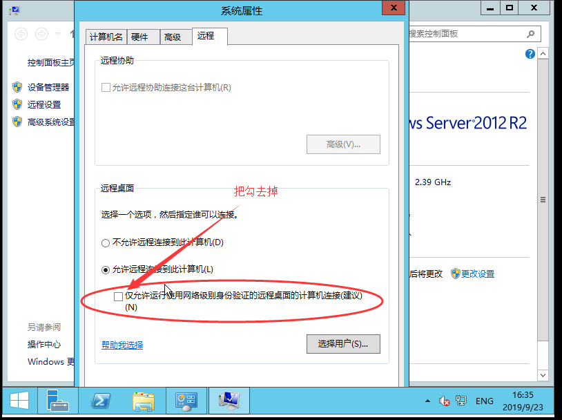 输入账号密码登录之后,打开系统属性,把【仅允许运行使用网络网络级别身份验证的远程桌面的计算机连接】的勾去掉。