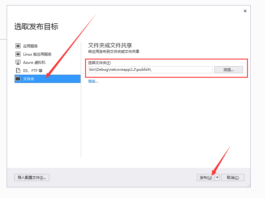 选取发布目标,选择文件夹,选择路径(我用的默认路径),然后点击发布。