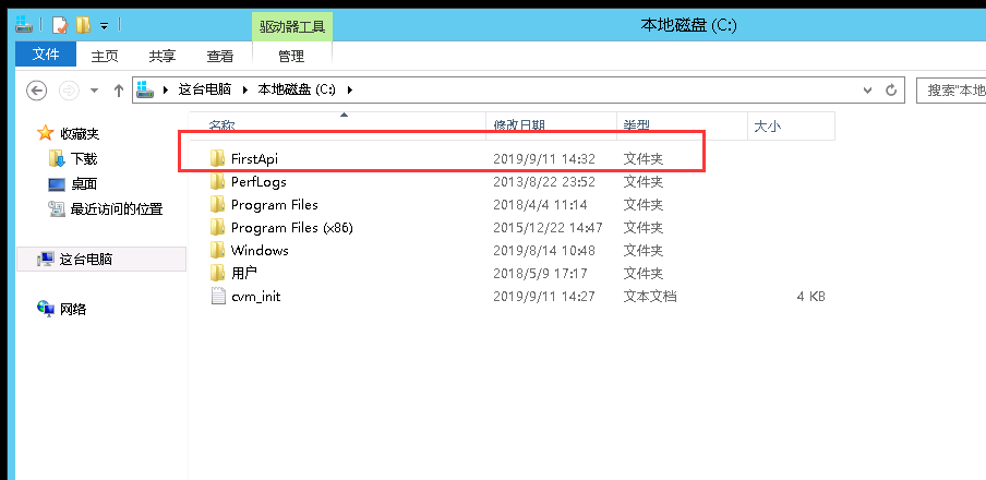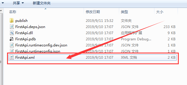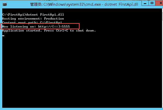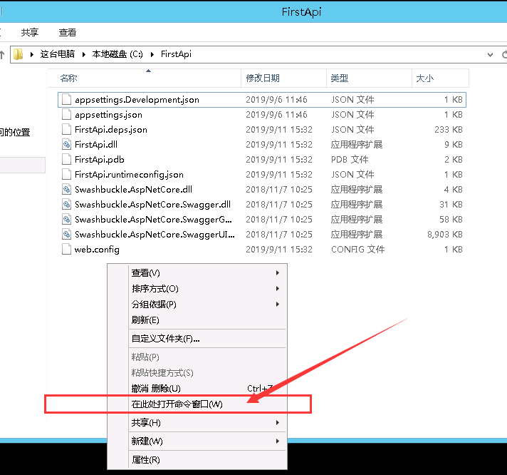 会发现我们cmd的路径直接在该文件夹里,然后执行下面的命令(FirstApi是你的项目名,也就是上图中FirstApi.dll文件)。