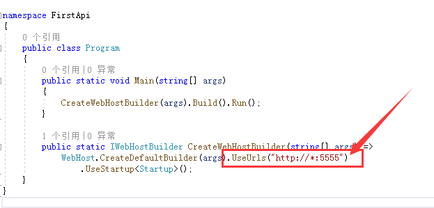 WebHost.CreateDefaultBuilder(args).UseUrls("http://*:5555")