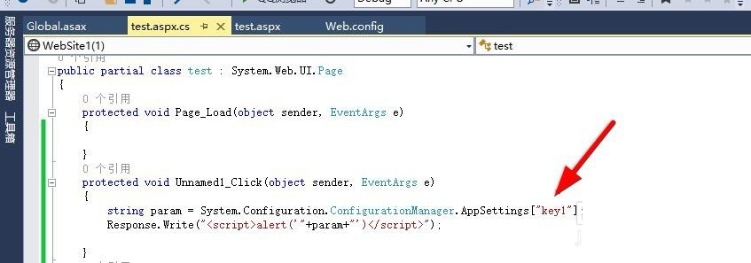 最后,在项目中的“test.aspx”文件中,获取你设置的全局变量"string k = ConfigurationSettings.AppSettings["key1"]; ",详细代码见下图。