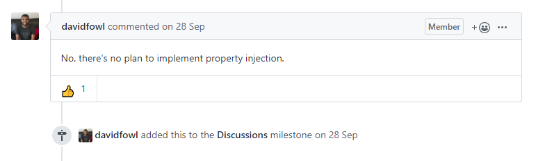 到现在为止,尽管找到了一种看起来合理的方案,但还是不够优雅,使用过其他第三方DI框架的朋友应该知道,属性注入的快感无可比拟。那原生DI有没有实现这个功能呢,我满心欢喜上G站搜Issue,看到这样一个回复(https://github.com/aspnet/Extensions/issues/2406):