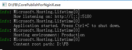 如上图,项目发布成功,现在进入发布的文件夹,会看到很多文件,我们在其中找到CorePublishForNginX.exe;然后双击运行,测试一下是否可以访问。