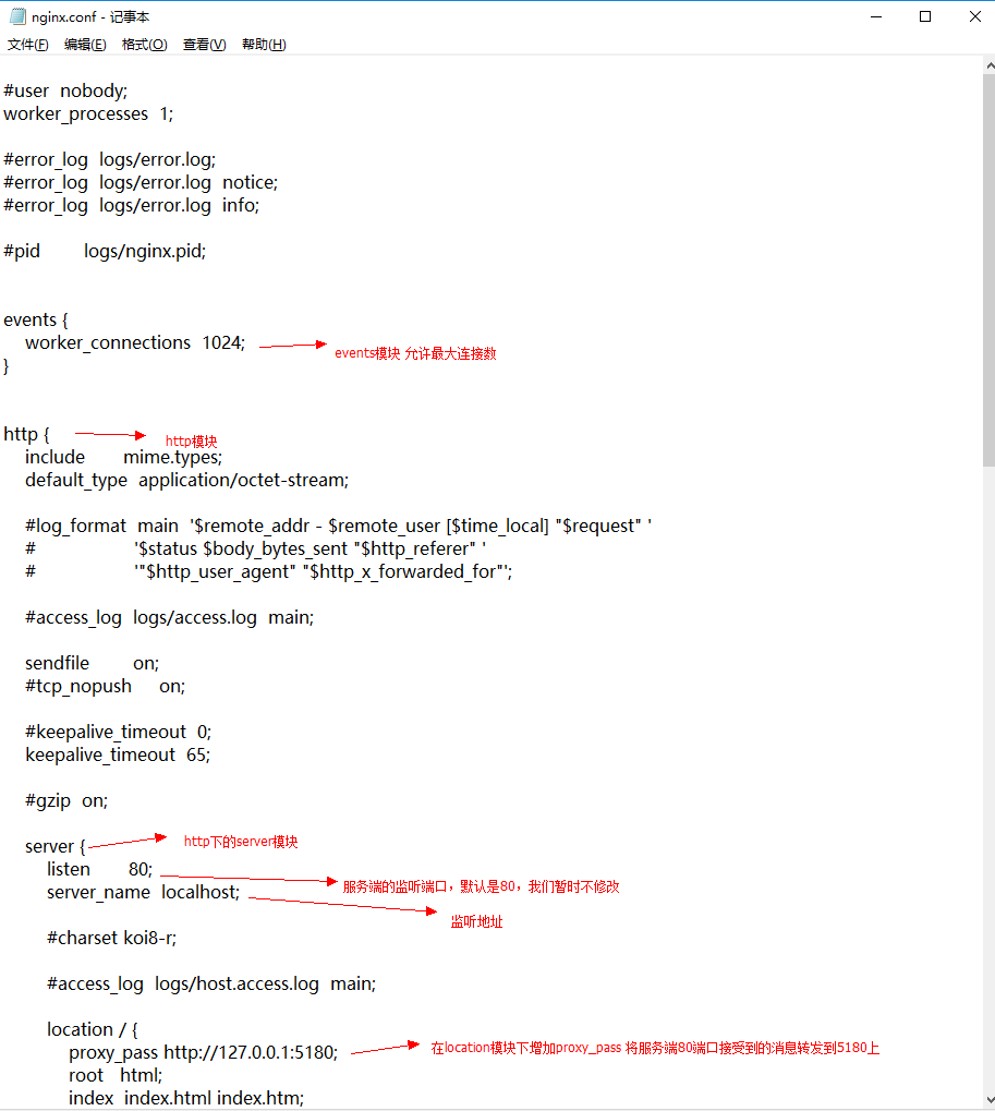上文中,我们的WebApi项目监听的是5180端口,而NginX启动后默认监听的是80端口;也就是说,我们需要在NginX的配置文件中,将80端口监听到的消息,转发到5180端口上。