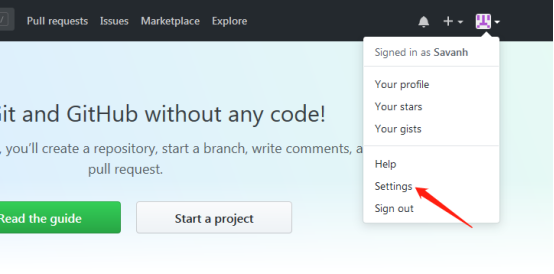 1:点击你的GitHub头像,选择下拉框中的“settings”: