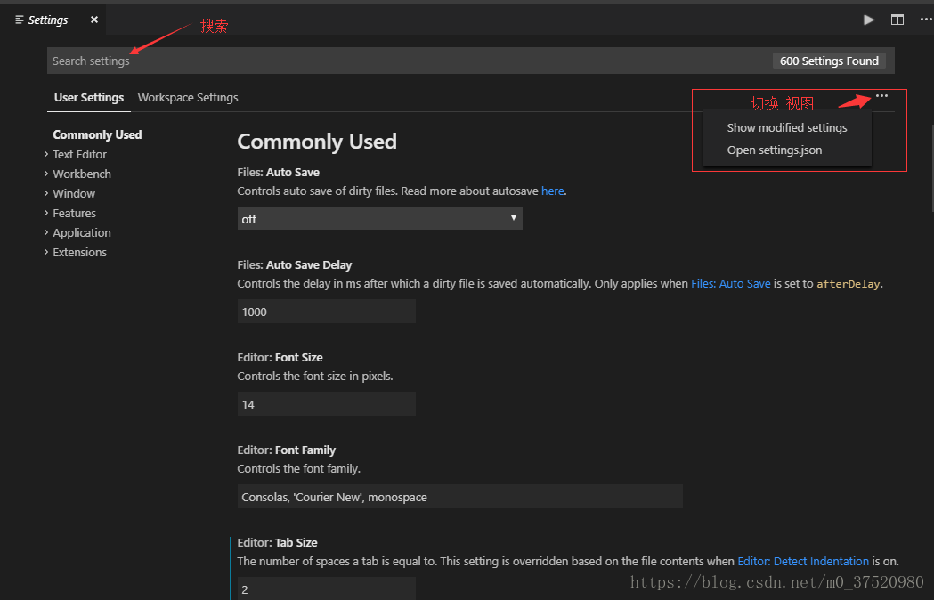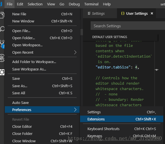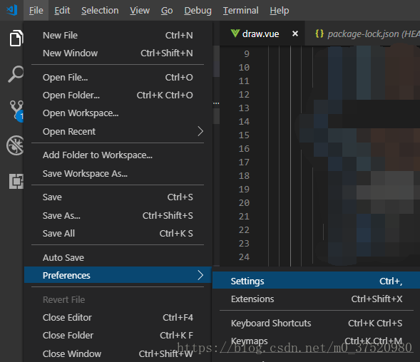 1> 鼠标操作打开。File --> Preferences --> Settings