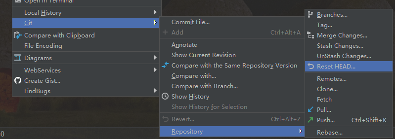 合并完成后,但是由于一些问题,我们想要取消本次合并,右键 git,选择 Reset HEAD