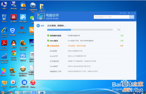 第四步:点击红色X后会进到以下这个正在检测页面,系统会自动帮你修复,然后黄色感叹号就给修复好了,如图所示如果不行,请试第二个方法