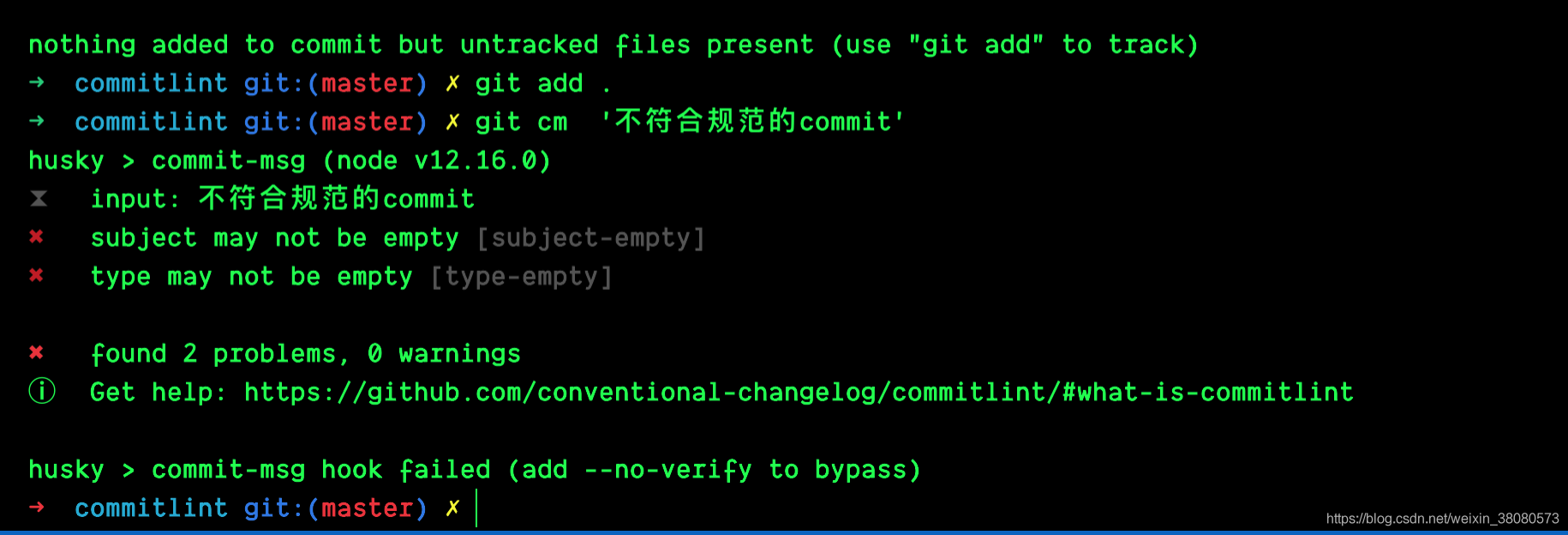 至此,每次提交如果不符合规范就会提交失败,类似下面这种提示