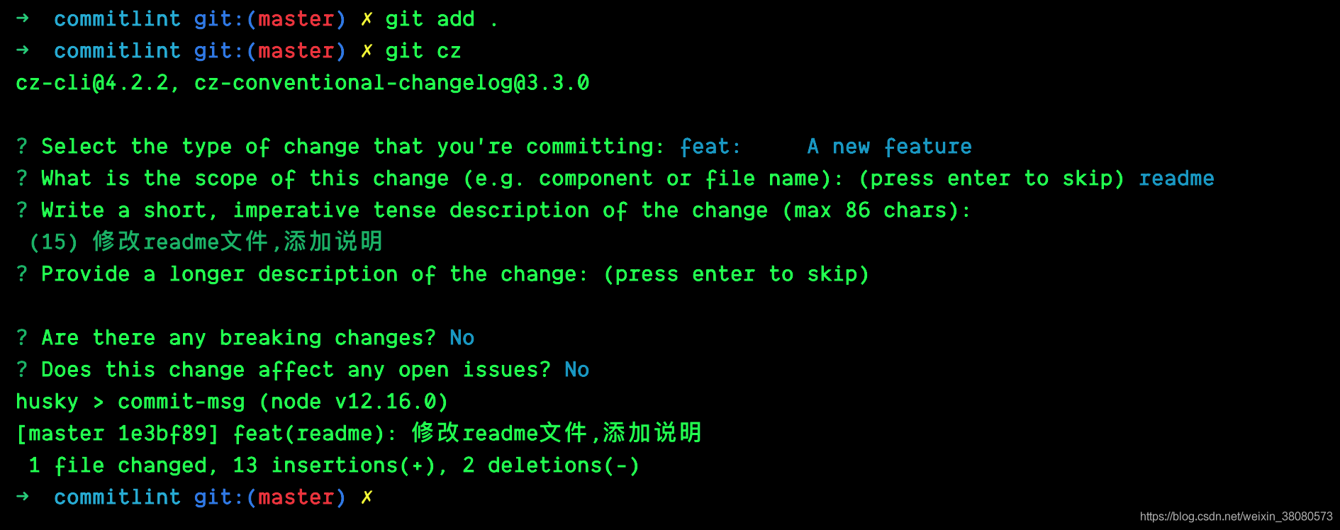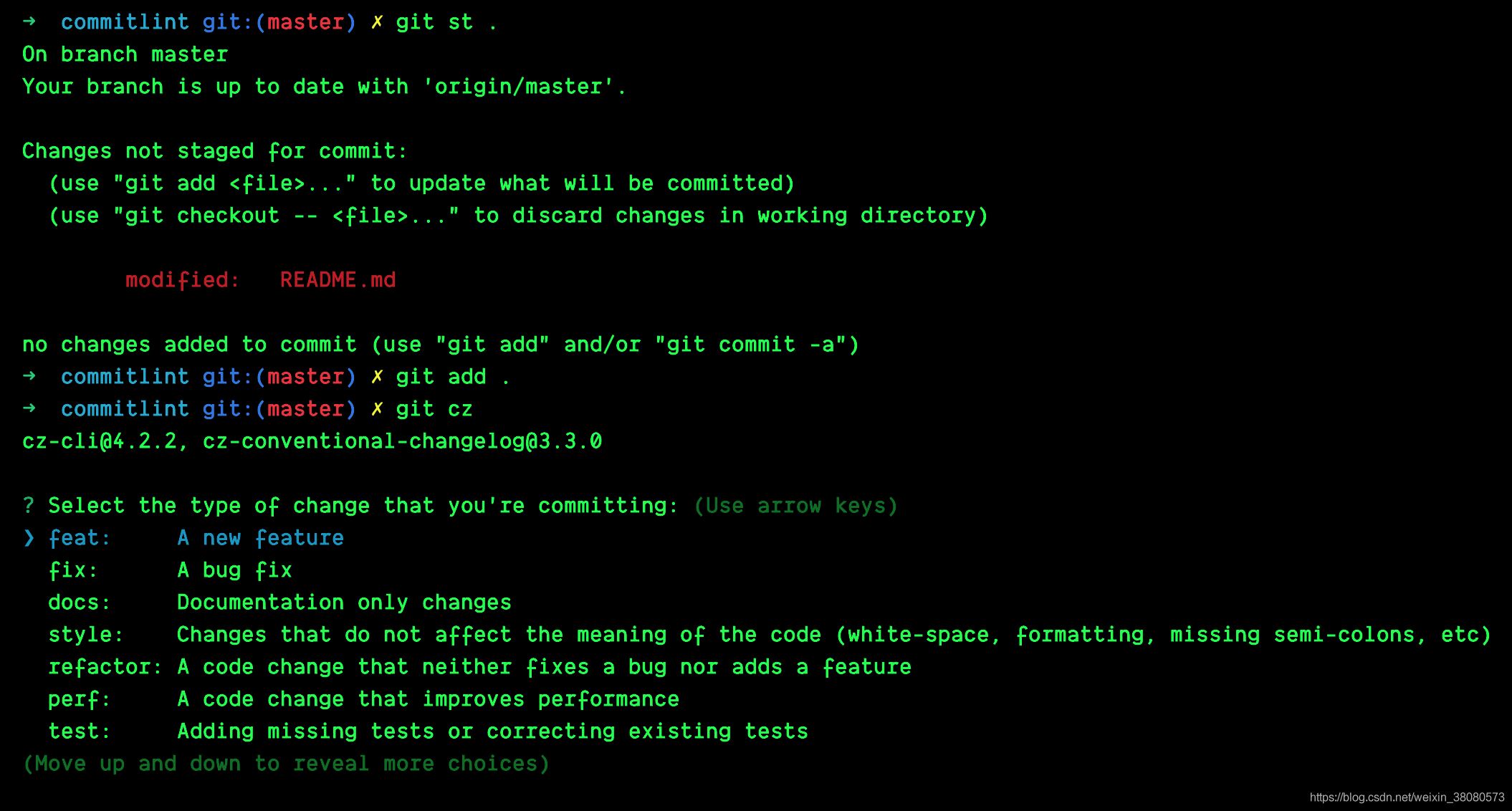 安装之后在需要使用git commit的地方使用git cz 代替,就会出现交互式命令行窗口,直接选择对应的选项让后填写即可