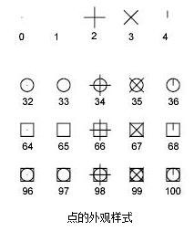 2、共有20种点的样式,系统默认的点样式是第一种(在未作出修改的情况下)。点的样式可以通过设置"pdmode"、"pdsize"两个系统变量来改变点的样式。Pdmode设置点的外观,它的取值是整数,共分4组:0-4;32-36;64-68;96-100;