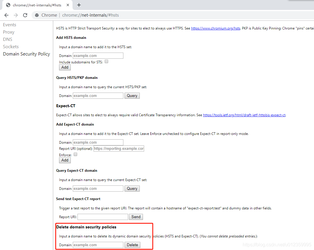1.地址栏中输入chrome://net-internals/#hsts。