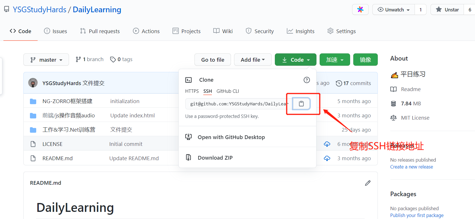 1、复制GitHub存储库的SSH链接地址: