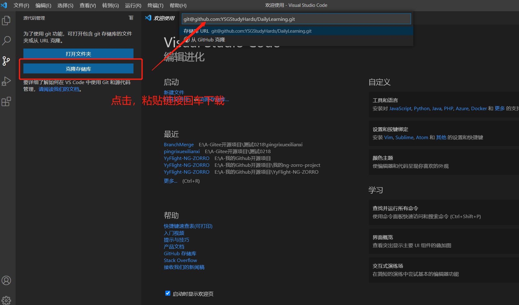 2、打开VS Code点击克隆,粘贴SSH链接地址进行下载: