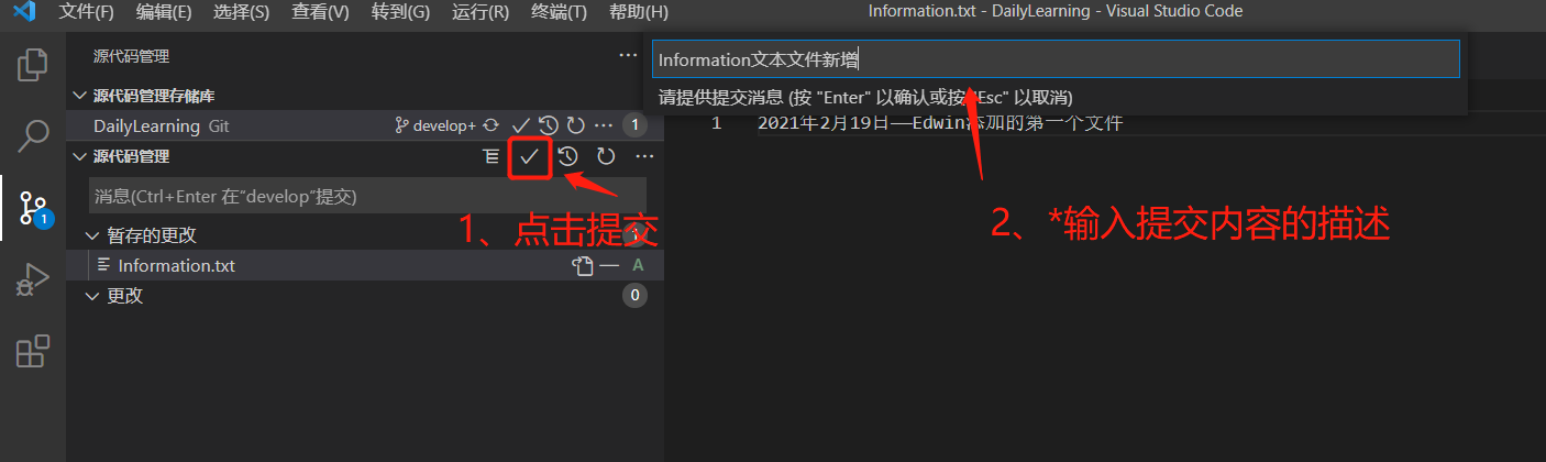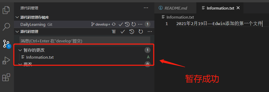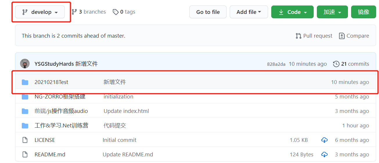 首先我们在feature-20210218子分支中创建一个文件夹和一个文本文件,然后将feature-20210218子分支合并到develop开发分支中合并提交到远程代码库。