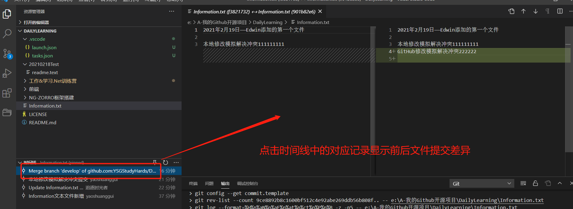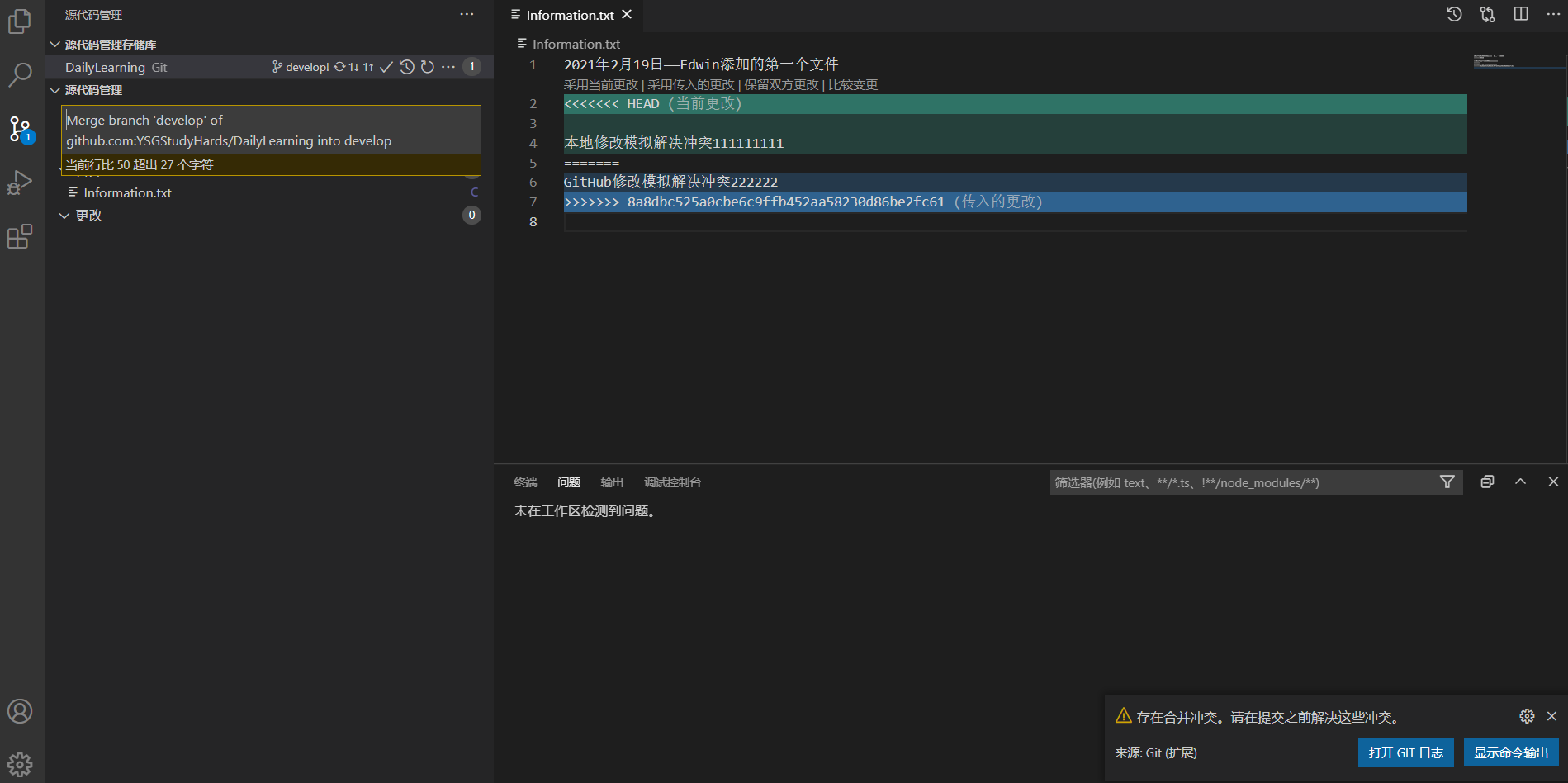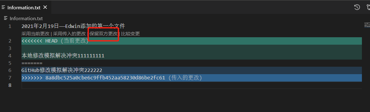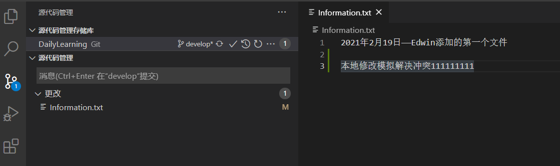 接下来我们来自己模拟一下多人开发,如:我在本地修改Information.txt文本文件的内容,然后在到GitHub中修改一次这样本地在提交的时候就会产生冲突,然后我们可以借助VS Code智能的解决冲突的方式帮助我们来解决冲突。