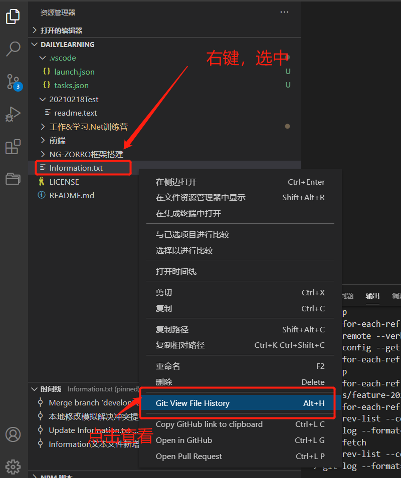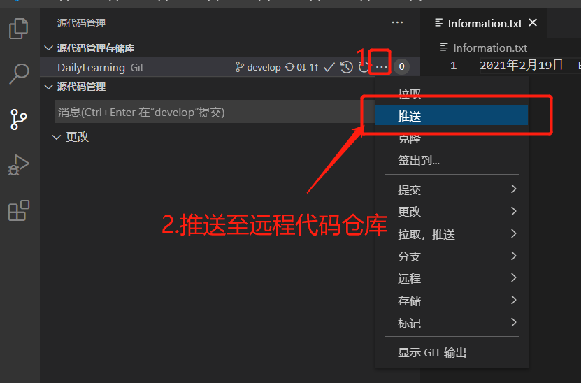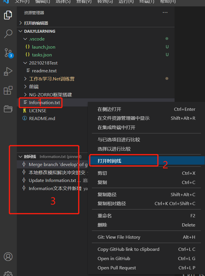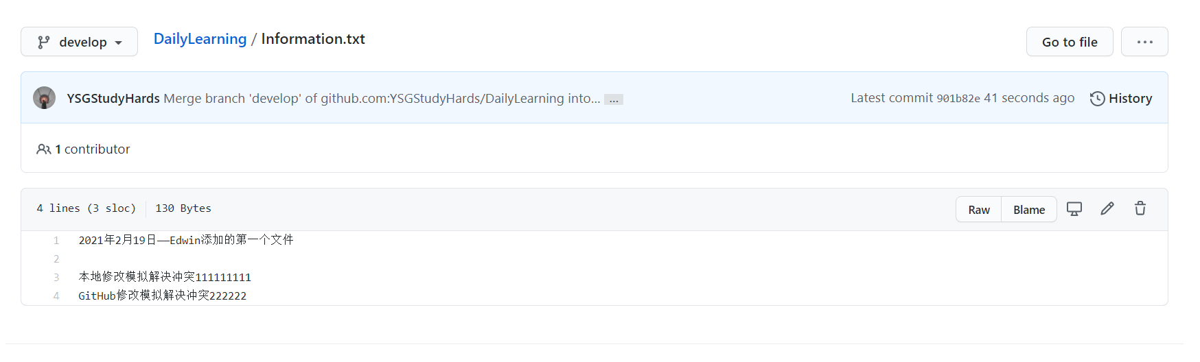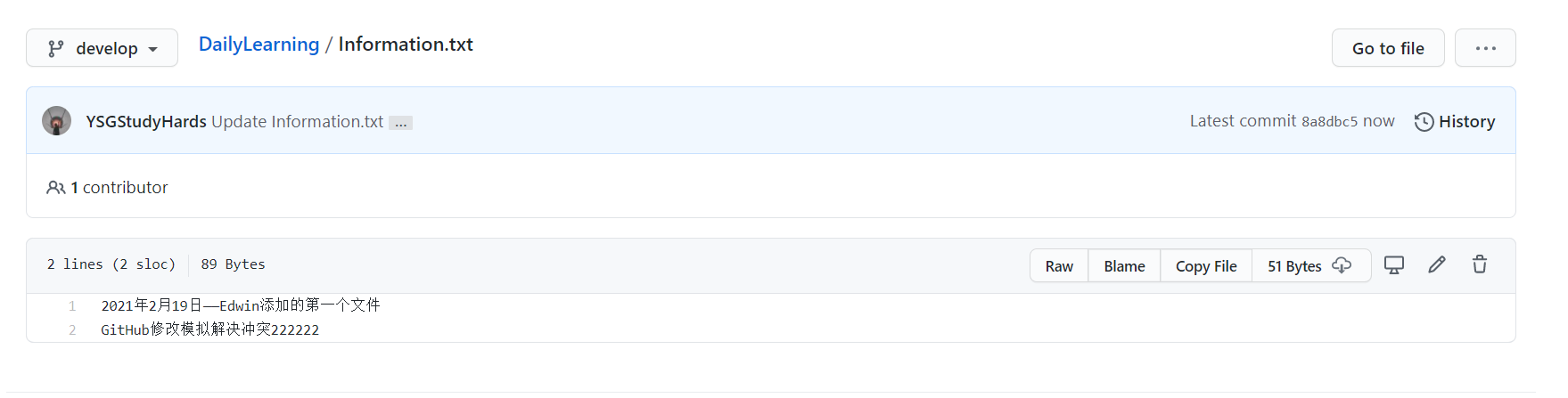 接下来我们来自己模拟一下多人开发,如:我在本地修改Information.txt文本文件的内容,然后在到GitHub中修改一次这样本地在提交的时候就会产生冲突,然后我们可以借助VS Code智能的解决冲突的方式帮助我们来解决冲突。