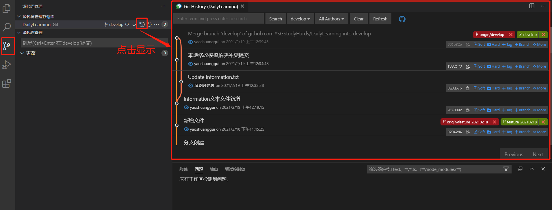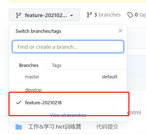 注意:我们这里为develop分支创建feature-20210218分支。
