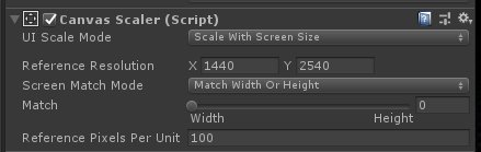 可将Canvas物体上CanvasScalerde UIScaleMode设置为“ScaleWithScreenSize”,将ReferenceResolution设置为目标设备的分辨率(比如x:1440,y:2540),如下图