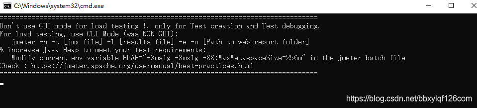 双击双击jmeter.bat后会出现一个cmd命令框(这个命令框不能关闭),随后会弹出命令行界面,如下图所示: